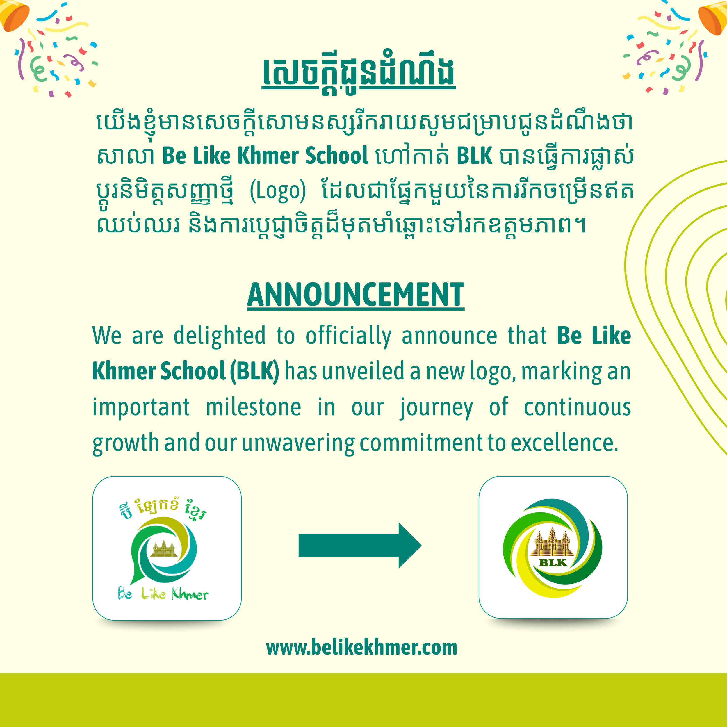 We are delighted to officially announce that Be Like Khmer School (BLK) has unveiled a new logo, marking an important milestone in our journey of continuous growth and our unwavering commitment to